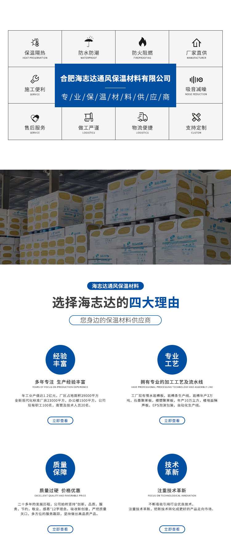 合肥海志達通風保溫材料有限公司(原海豐泡沫廠)成立于1998年,注冊資金2118萬,注冊商標"海志達"系列產品廣泛用于建筑、電力、船舶、公路鐵路、航空等領域,年工業產值達1.2億元,廠區占地面積39000平方,全新現代化標準廠房23000平方,辦公樓1500平方。公司現有職工100名,高管及技術人員20名。工廠現有憎水巖棉板,巖棉條生產線,巖棉年產3萬噸,石墨聚苯板,模塑聚苯板,年產10萬立方,樓地面隔聲板,EPS泡沫包裝,自動化生產線,公司擁有標準化產品實驗室,企業并通過ISO9001質量管理體系認證和ISO14001環境管理體系認證,工廠現座落于合肥市肥東縣梁園鎮梁園社區,是安徽地區一家生產企業。